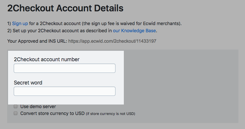 - Enter your 2Checkout account number (Merchant Code) and Secret word:
