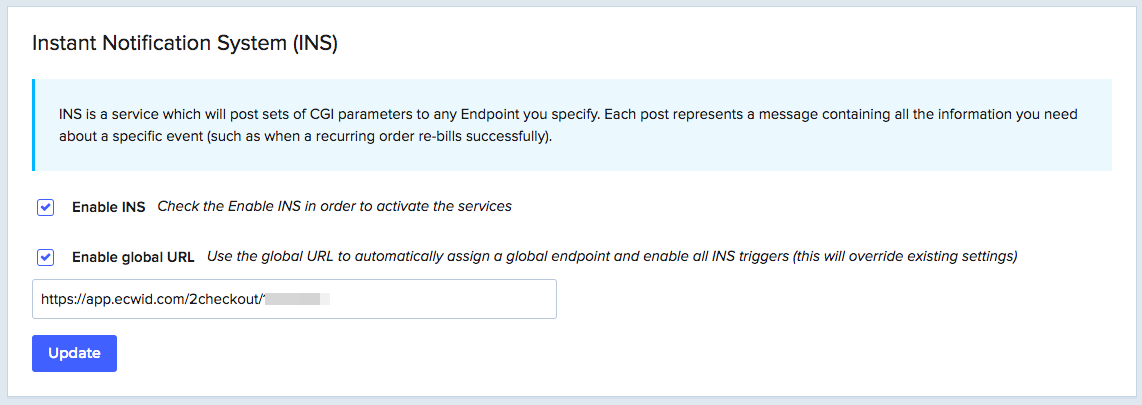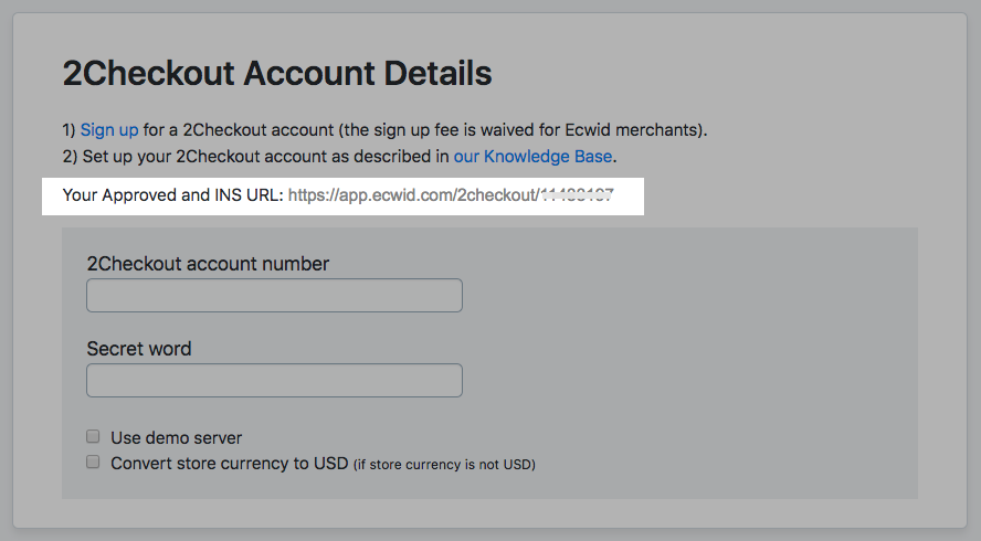 - You will see 2Checkout Account Details. Find and copy your Approved and INS URL and save it somewhere – you are going to need it later: