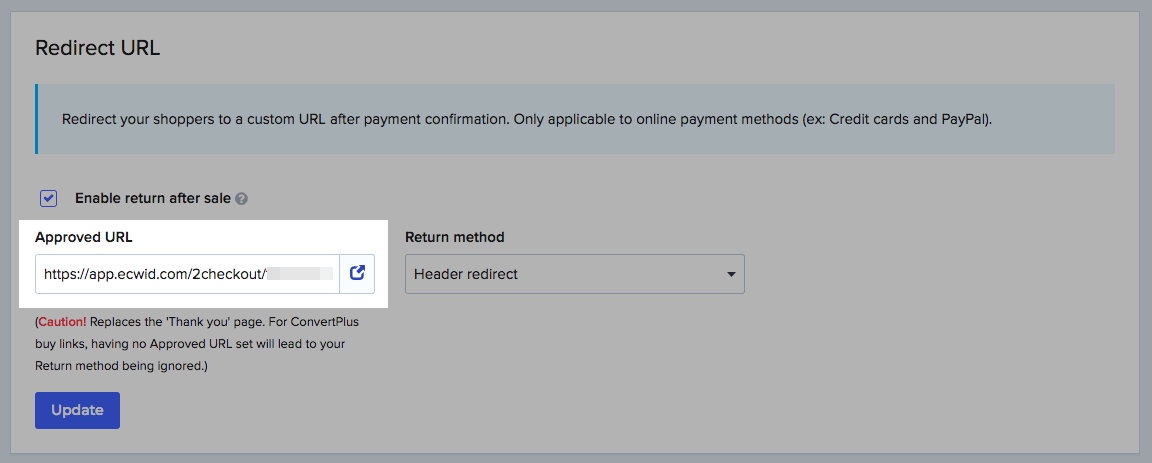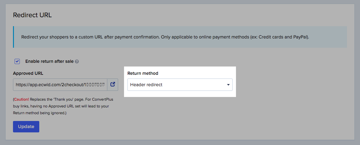 - Scroll down to Redirect URL section and set the Return Method to “Header redirect”: