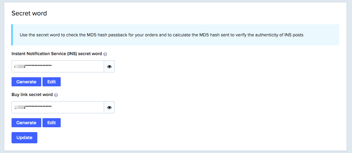 - Make sure both the INS and the Buy link secret word are set to the same value and copy it: