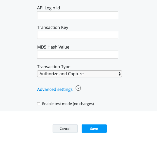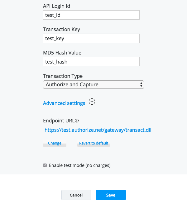 - Click Advanced settings and enter https://test.authorize.net/gateway/transact.dll as your Endpoint URL.