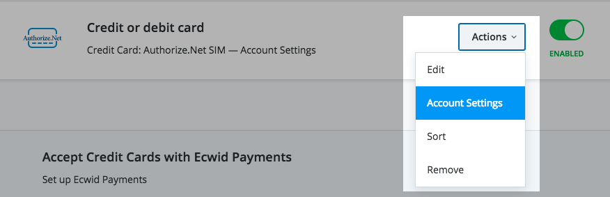 - Click Actions and then Account Settings next to the Authorize.Net payment method.