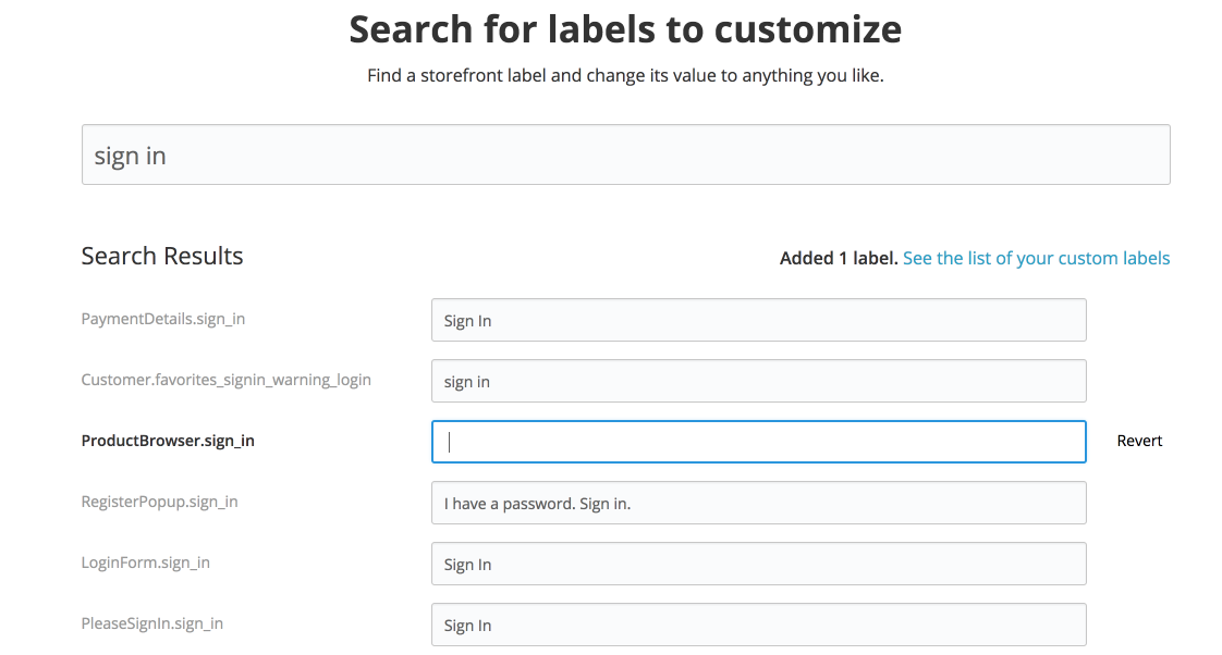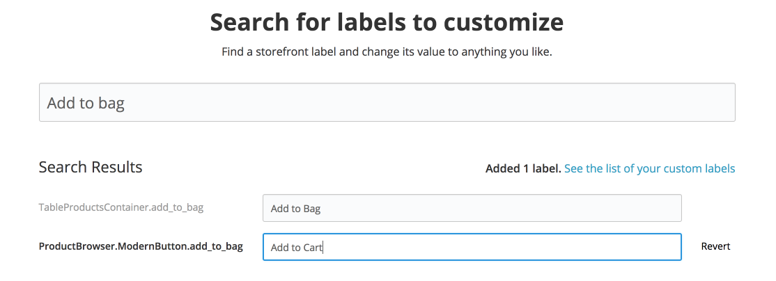 For instance, you want to change the default Add to Bag button to Add to Cart. Type "Add to Bag" into the search field, find the label and type "Add to Cart" in the text field to the right. The changes are saved automatically. Now the buttons will display "Add to Cart" in all your storefronts.