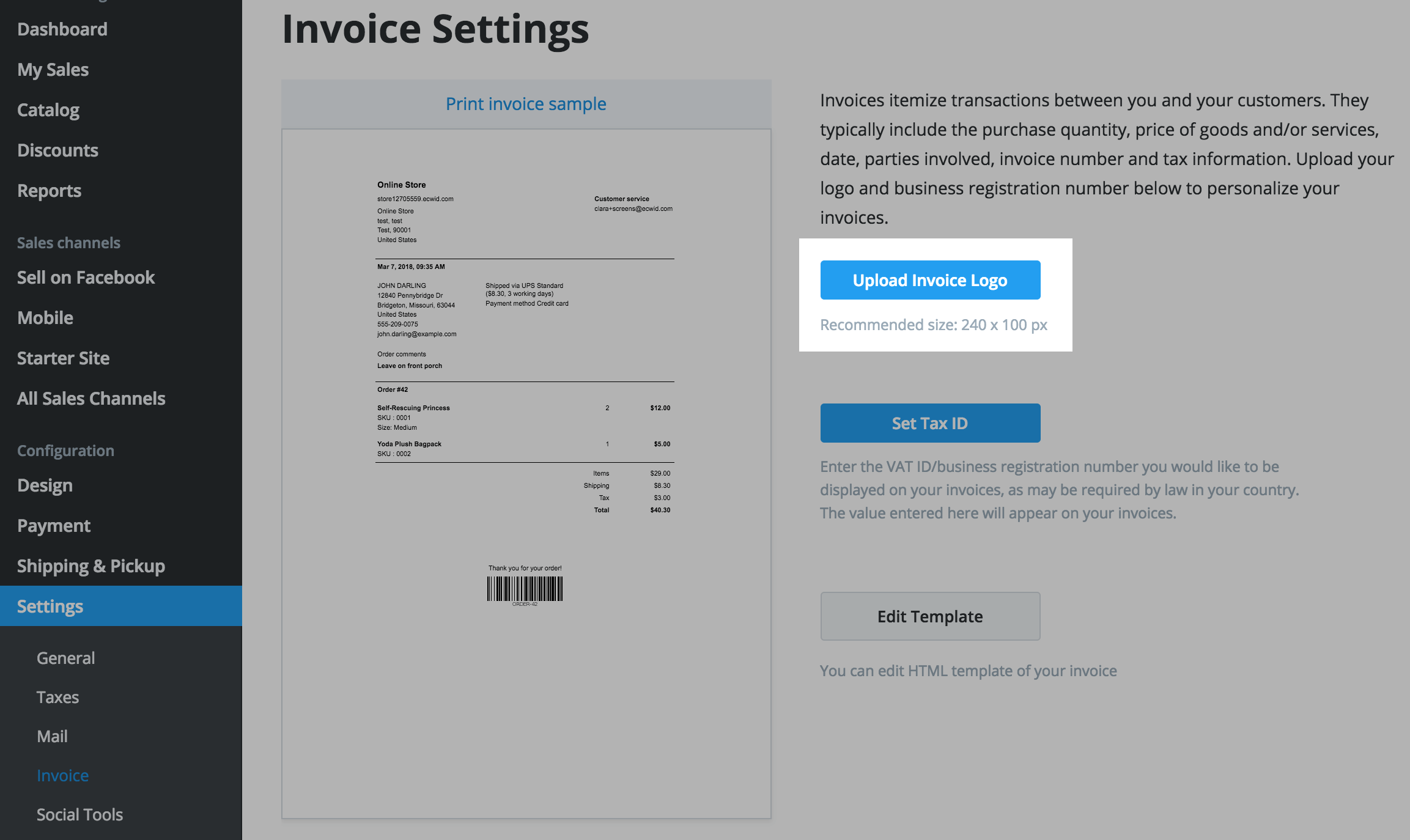 Once added, the logo is displayed on the printable sample. You can print the sample to make sure your logo looks just right. You can upload a different image by clicking on Change invoice logo or remove it at all.
