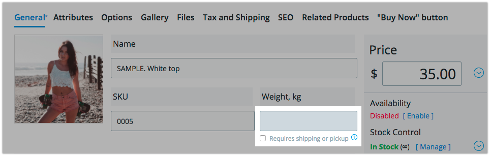 - Uncheck the option Requires shipping or pickup under the General tab.