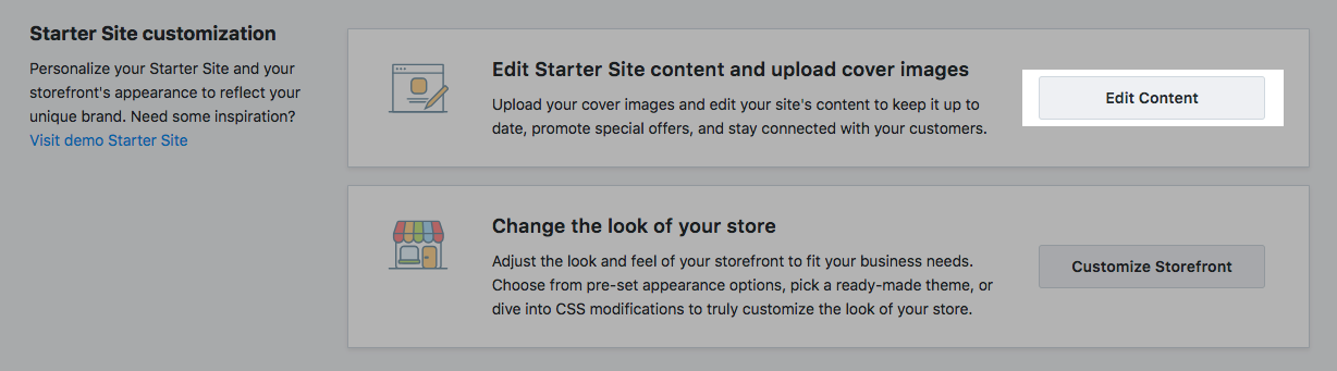 To edit your Storefront content blocks go to the your store Control Panel → WebsSite and click the Edit Content button: