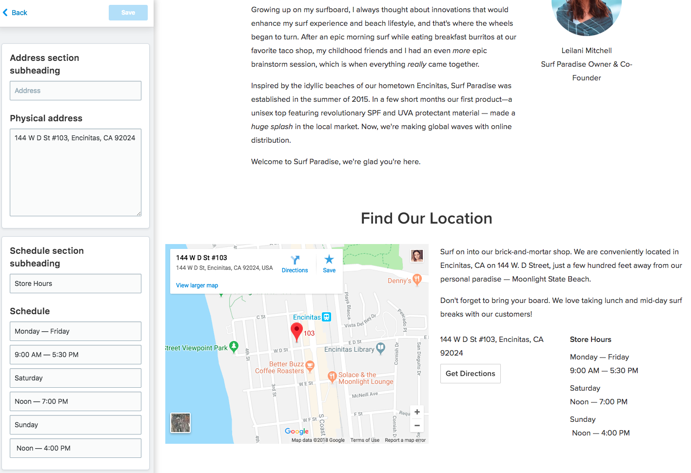 Enter the title for the address section to the Address section subheading and type in your store’s address to the Physical address field. The location will be automatically tagged on the Google Maps. Your customers will also be able to build a route to your store from their current location on click to the Get Directions button.