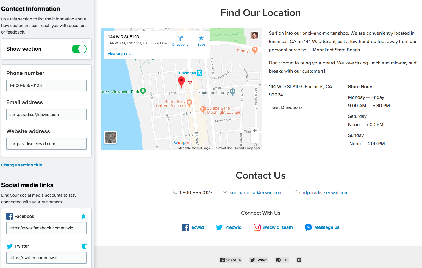 As the name suggests, in this section you can display your contact details and provide links to your accounts in the social media. The visitors will be able to easily share your website with their social media followers which is a great way to increase awareness about the products you sell and get your customers engaged with your brand.