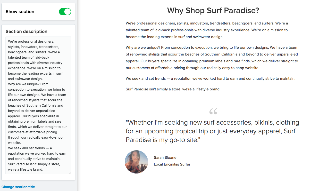 You can use this section to share the story of your business, how it has started, why you have picked this niche. You can also describe the advantages of your products, how your customers can benefit from your store, the goals you are trying to achieve with your business and anything else that would help customers understand your values.