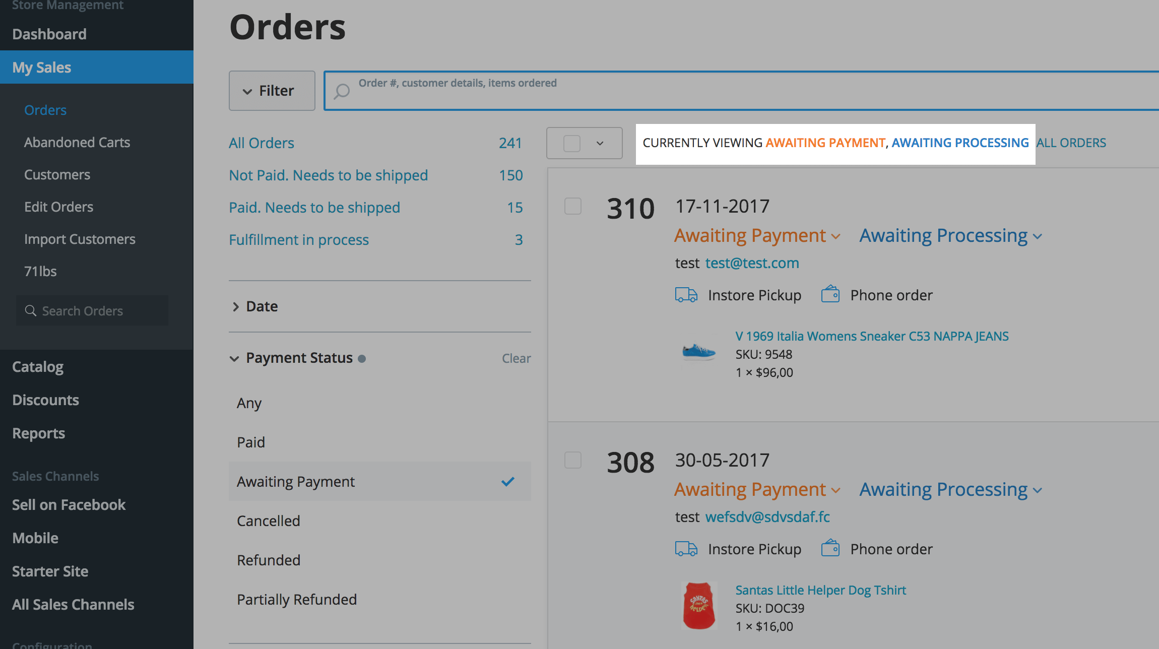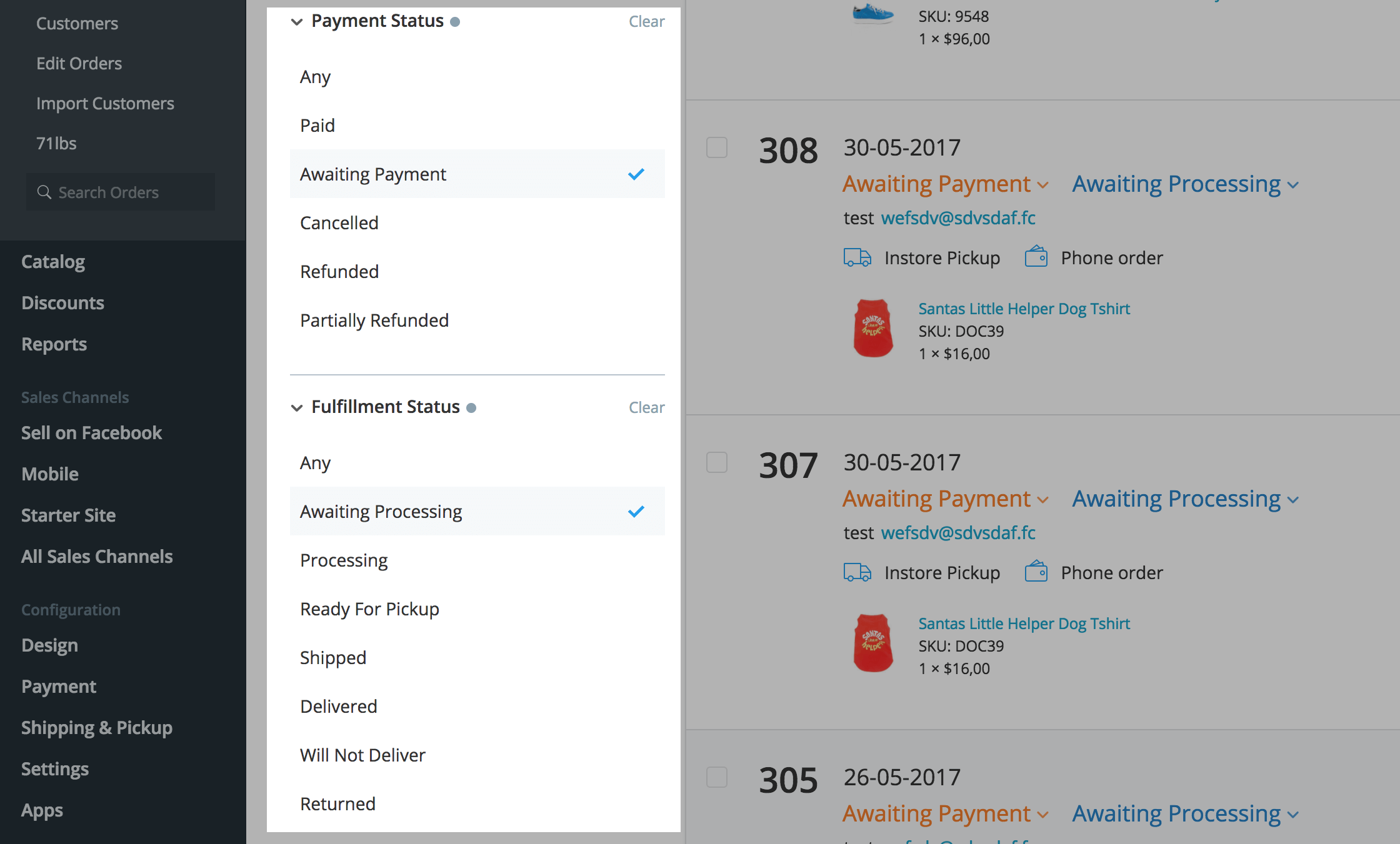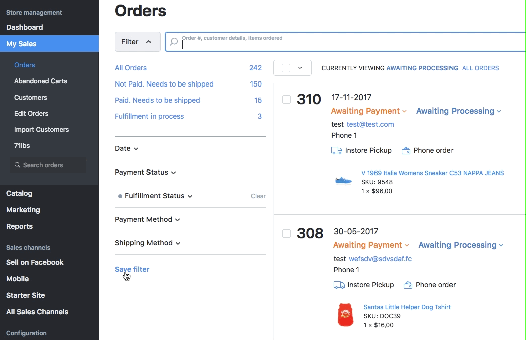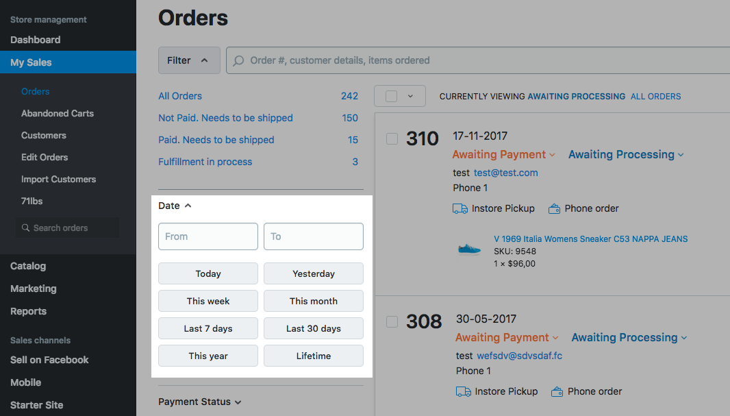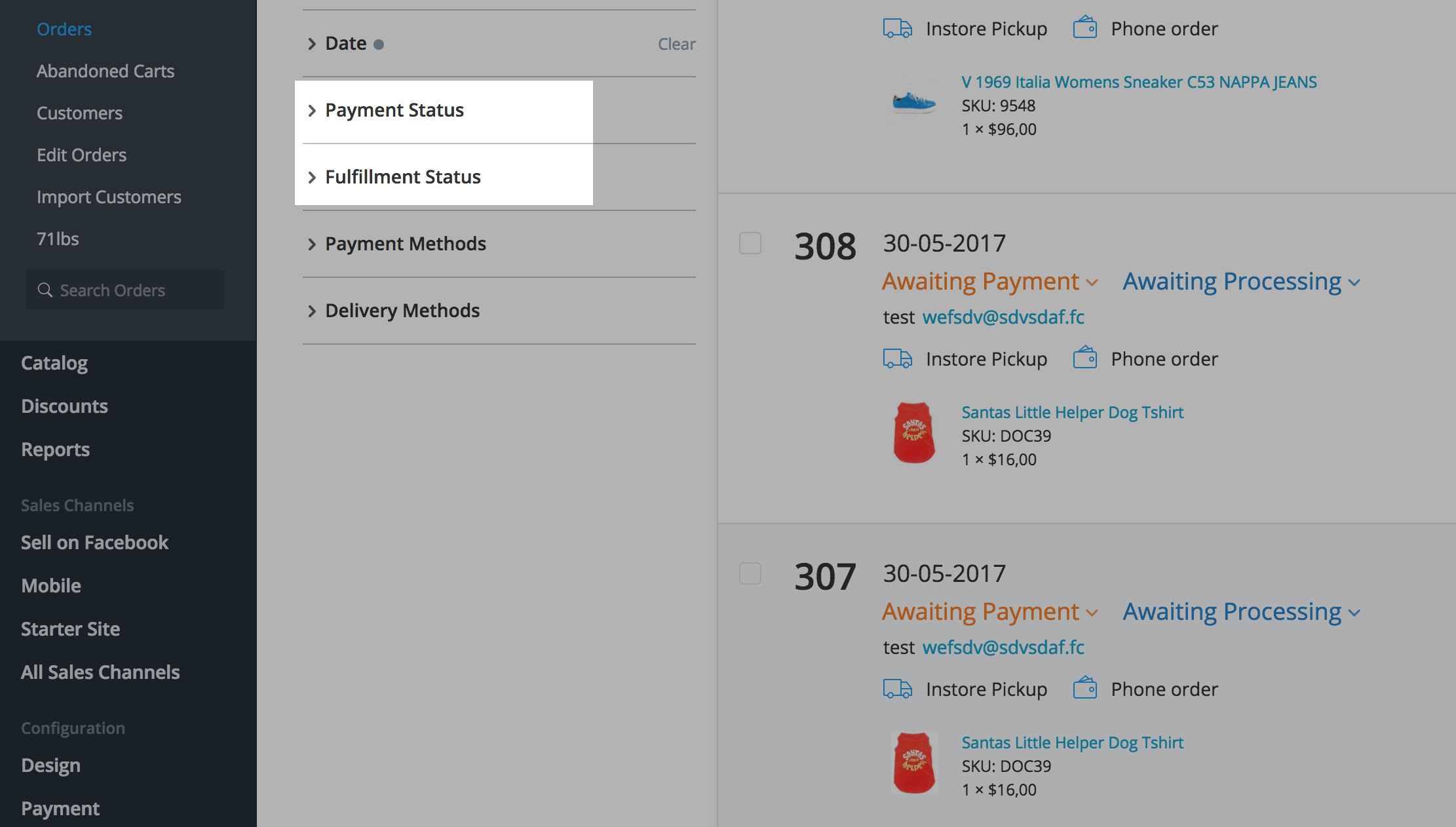 For instance, you need to see a list of orders that haven't yet been paid for and reach out to the customers for settling the payment. In this case you can filter your orders by payment status. Or you are preparing parcels for dispatch and want to find all orders that are awaiting processing. Here you can filter your orders by fulfillment status.