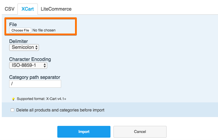 - Import product options using X-cart format in Control panel → Catalog → Products → "Import products" button → "XCart" tab: