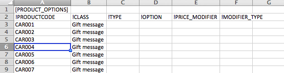 When this file is imported (see the original file in Attachment - import_options3.csv), all products with SKUs = CAR001 - CAR007 will get new "Gift message" option at the same time.