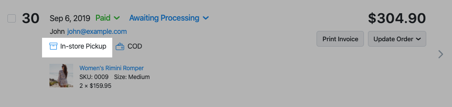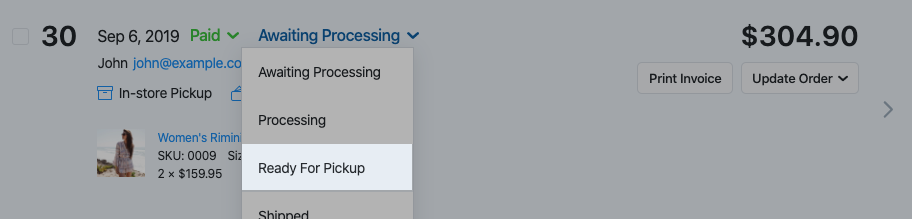 To inform the customer that their order is awaiting pickup, simply change its Fulfillment Status to Ready for Pickup. Your store will send the corresponding email notification to the customer’s email address.