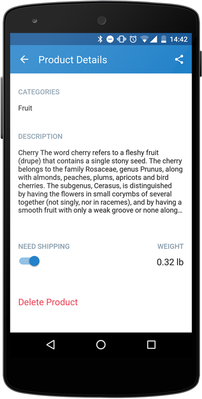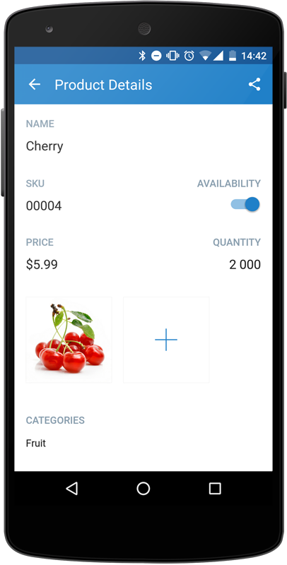 Using Mobile app for Android you can change the names, SKUs, weights, prices and quantities of your products. You can also turn their availability on and off in a single tap, upload new product images right from your phone camera or from the file storage, and edit product descriptions.