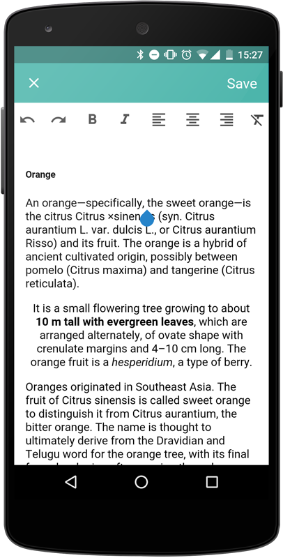 6. Tap again to see it with formatting and once again to enter the edit mode. Here you can change the text itself and also manage the formatting with the help of the toolbar on the top:
