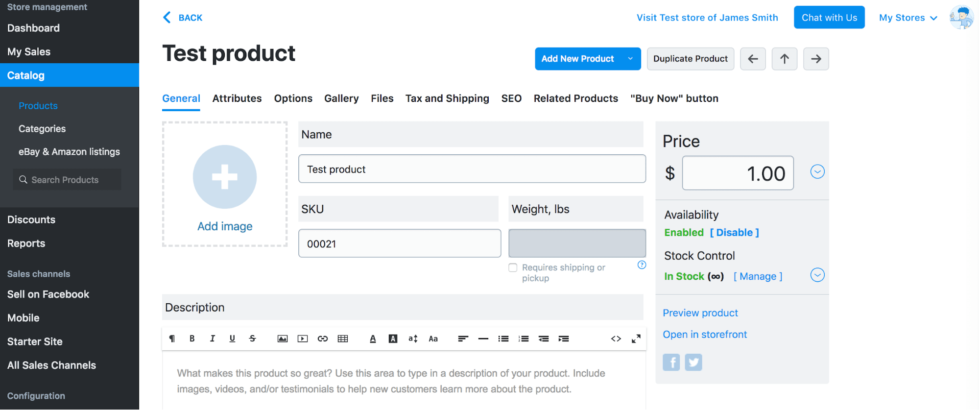 - Create a test product. Name it Test product so that your customers did not buy it by mistake. Set the price of $1: