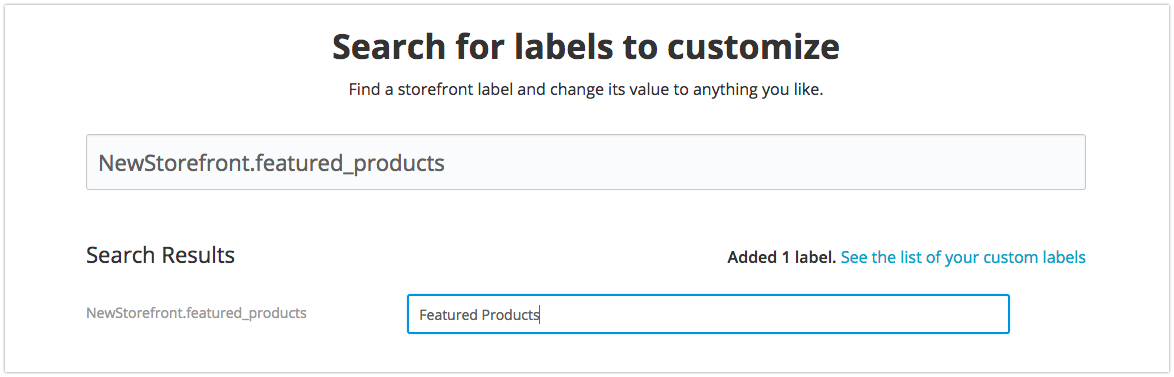 - Type in the label name “NewStorefront.featured_products” in the search box.