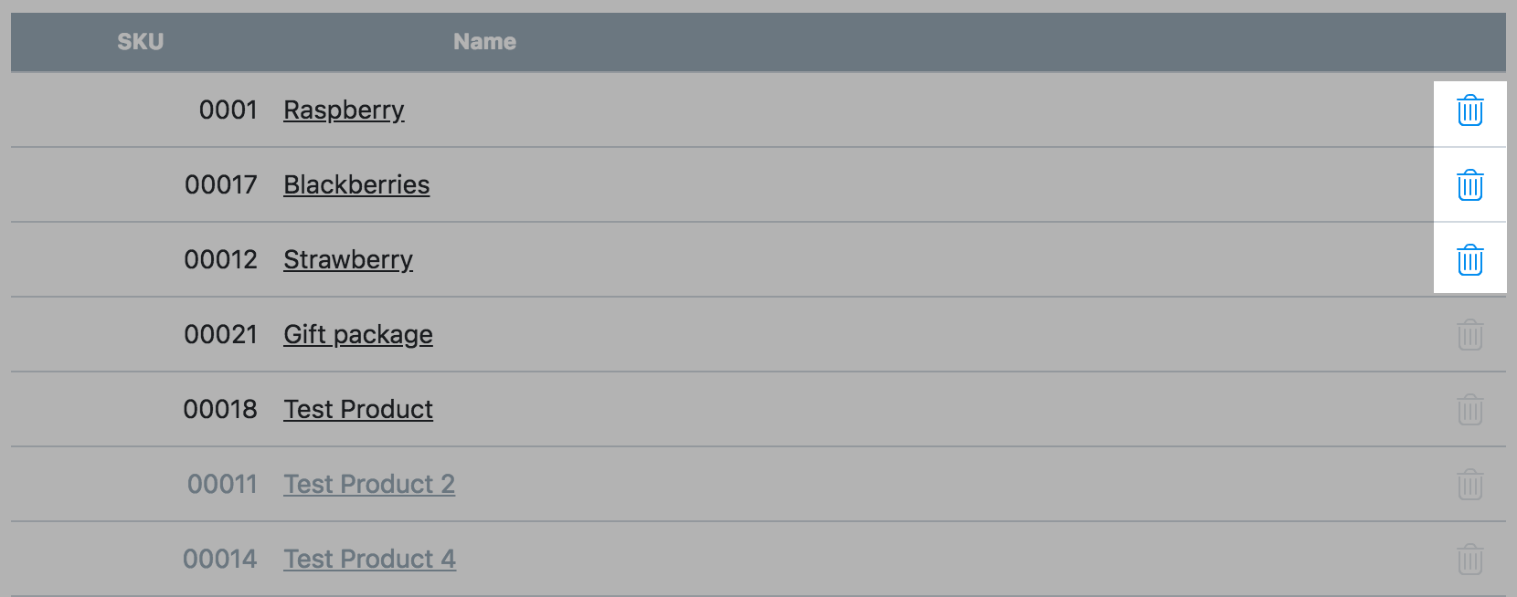 If the trash icon next to a product is greyed out, it means that this product is not assigned to any category other than the Store Front page. In this case you should first assign this product to some other category. After that you will be able to delete it from the Store Front Page.