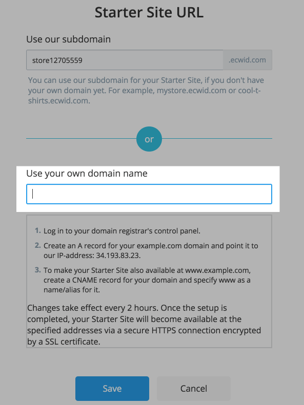 - In the pop-up click in the field under Use your own domain name and enter your domain there: