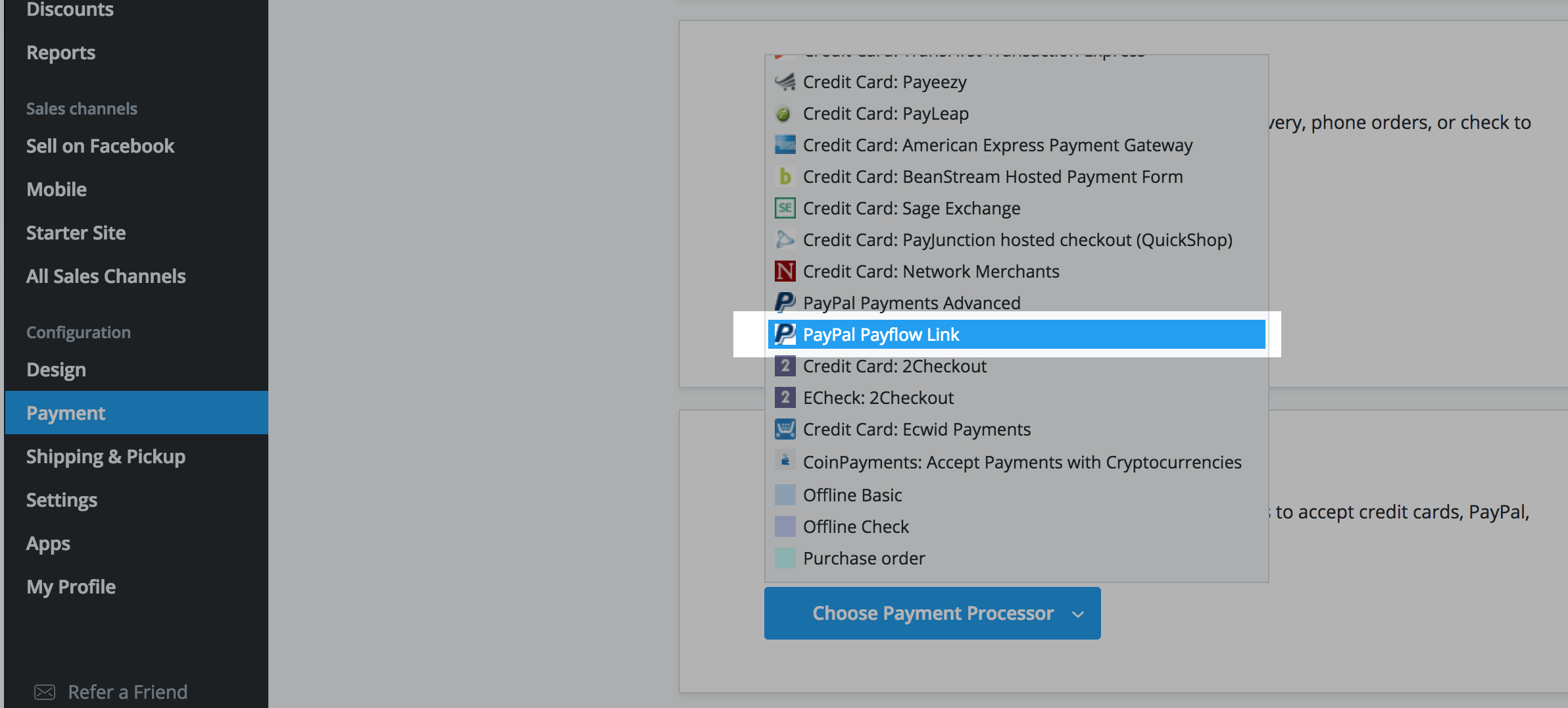 - Click Choose Payment Processor and select PayPal Payflow Link: