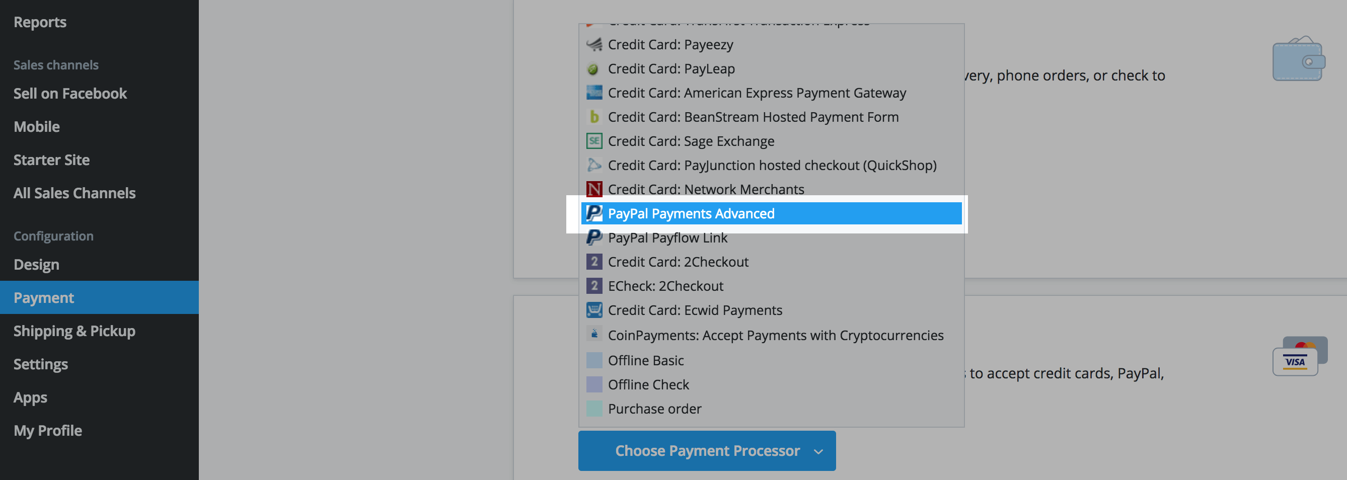 - Click Choose Payment Processor and select PayPal Payments Advanced: