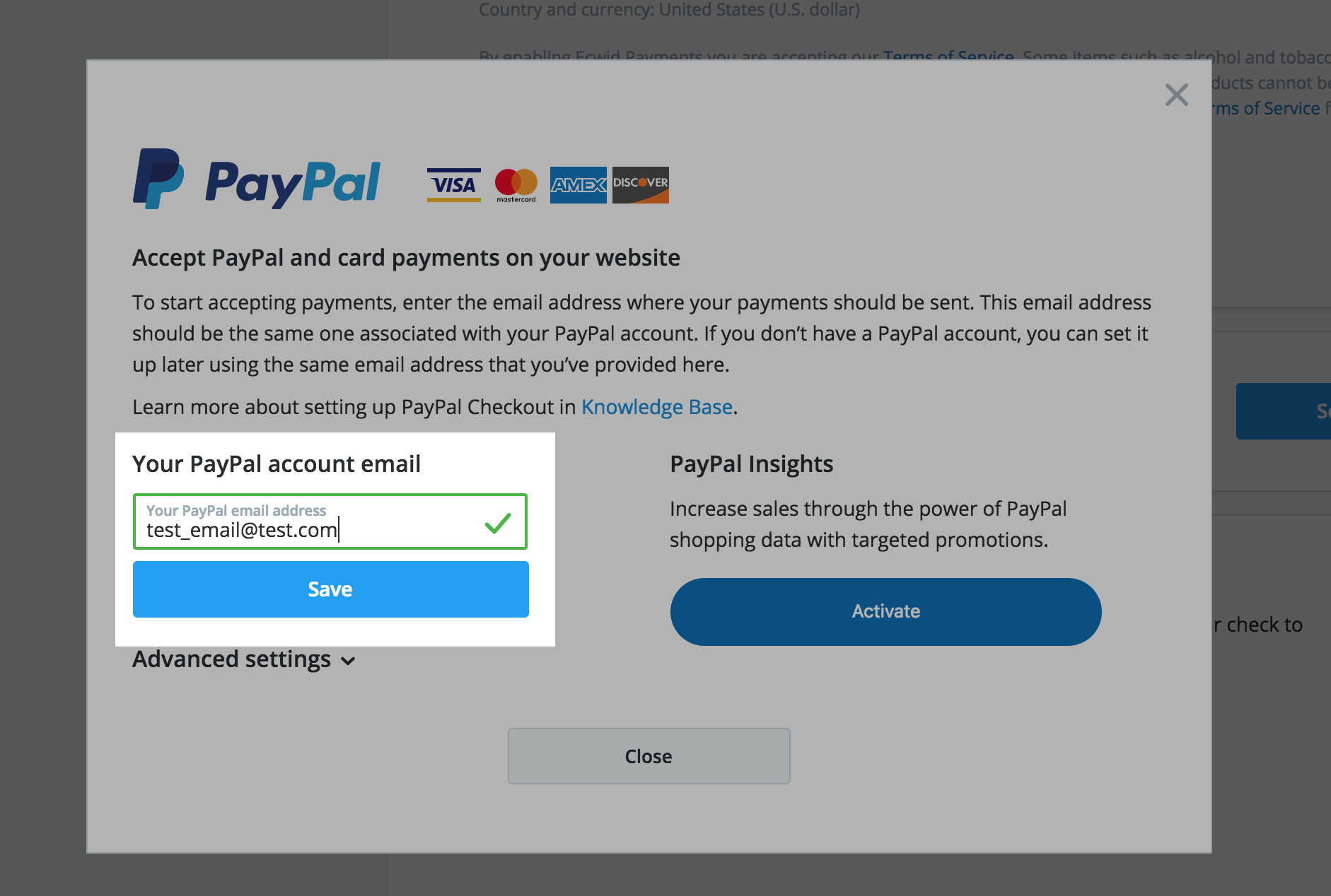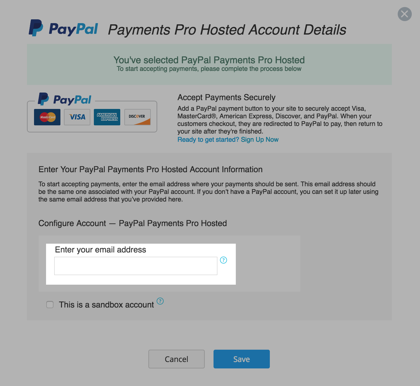 - Enter your PayPal Pro Hosted email address in the settings popup: