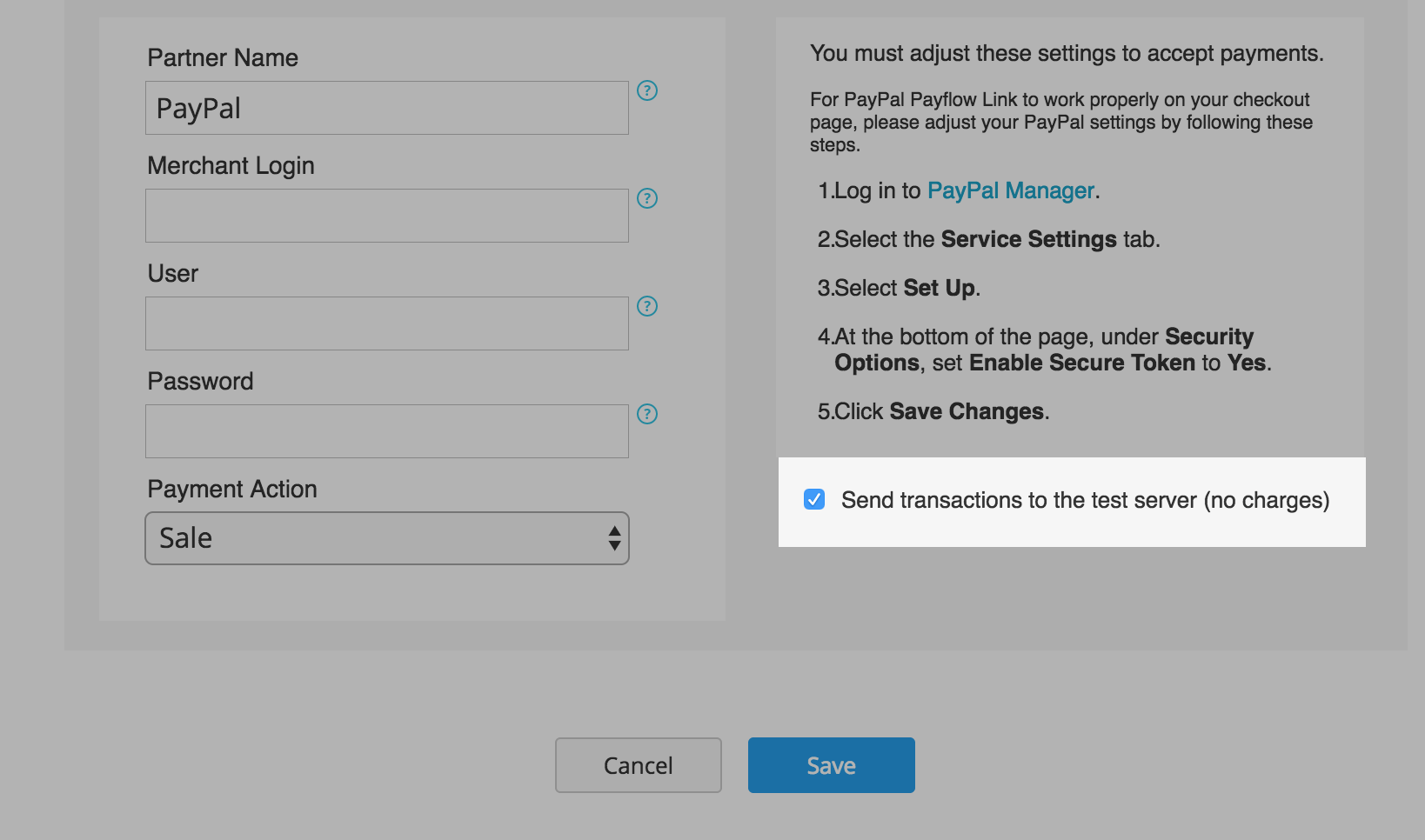 - Go to your Control Panel → Payment, PayPal Payflow Link section.